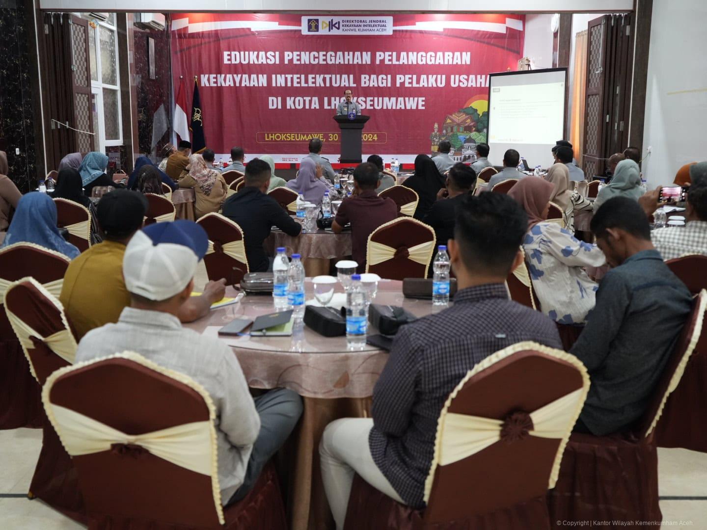 LHOKSEUMAWE - Kantor Wilayah Kementerian Hukum dan HAM Aceh terus memberikan pemahaman tentang Kekayaan Intelektual bagi masyarakat, salah satunya adalah kegiatan edukasi pencegahan pelanggaran Kekayaan Intelektual baik bagi pelaku usaha maupun bagi mahasiswa di Kota Lhokseumawe.